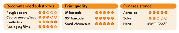 5111 is the standard resin ribbon for Corner Edge / TTO / Near Edge printers. It has become a reference for its sharpness. It is also unequalled as regards to its high level of mechanical resistance and its ability to print at high speed.