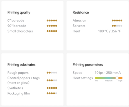 GTR10 is the Premium resin ribbon for Corner Edge / TTO / Near Edge printers. It has become a reference for its sharpness. It is also unequalled as regards to its high level of mechanical resistance and its ability to print at high speed.
